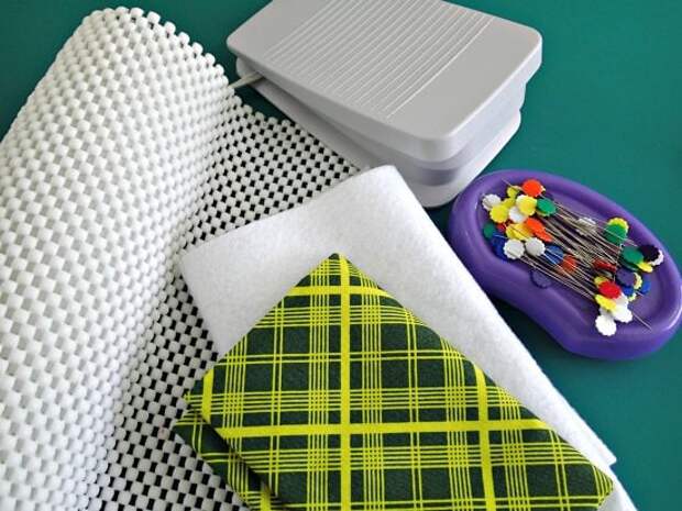 Ножная педаль часто скользит по полу. Чтобы ее зафиксировать, опытные швеи делают специальный противоскользящий коврик. Для его изготовления понадобится немного вспененного нескользкого материала (чаще всего он встречается в отделах для ванных комнат) и любой текстиль для его декоративного обрамления.