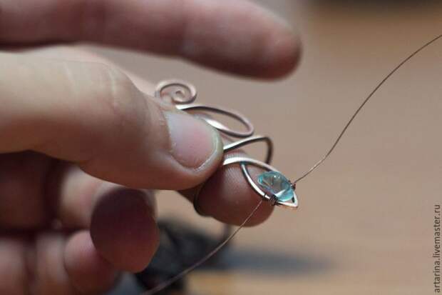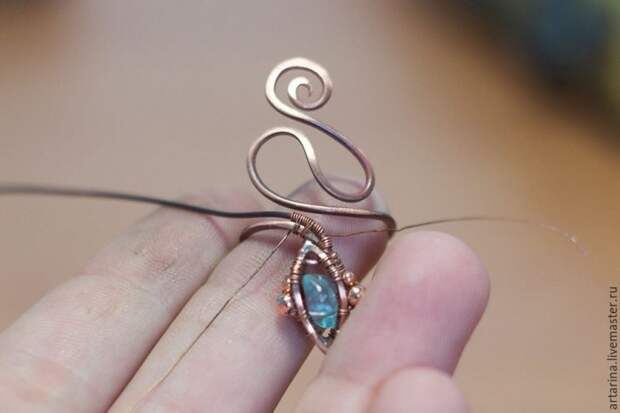 Подбираем подходящую крошку для вставки в голову. Иногда приходится повозиться, чтобы подобрать подходящий по форме камушек, который не будет выпирать снизу и мешать при носке. Разумеется можно использовать бусинку, камень в огранке и так далее. Приматываем его к заготовке головы.