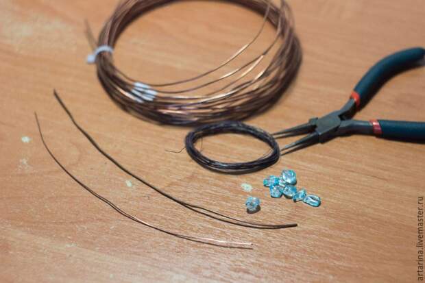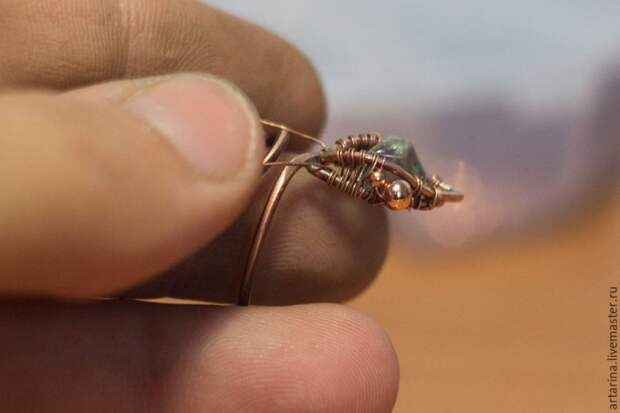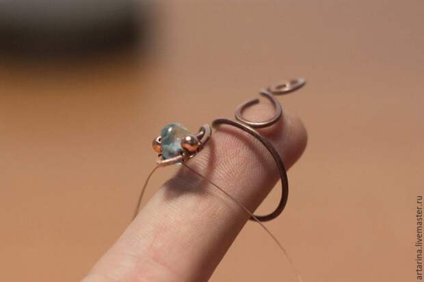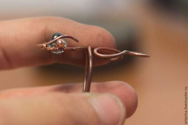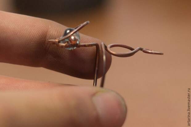 После того как камень закреплен, добавляем по краям две медных бусинки (глаза) диаметром 0,3 мм.