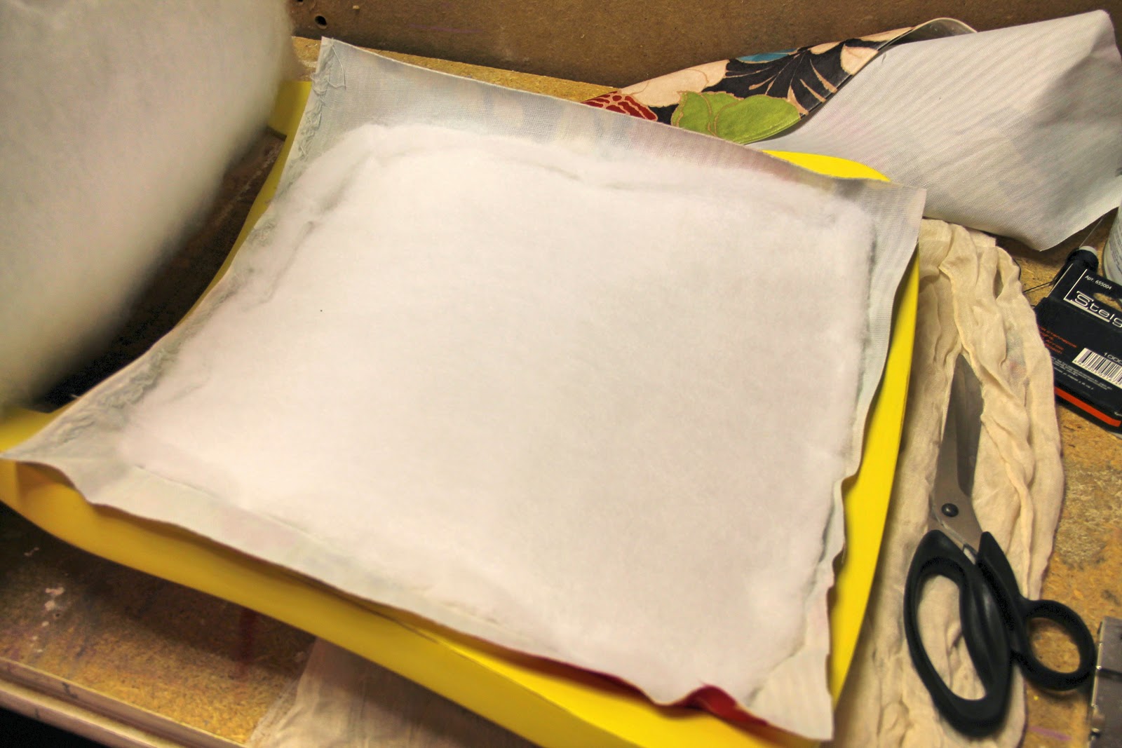Далее укладываем несколько слоев синтепона и прошиваем рядами с помощью плотных шелковых или нейлоновых нитей (в 2 нити), сильно не стягивая, как можно ближе к краю каркаса стула.
