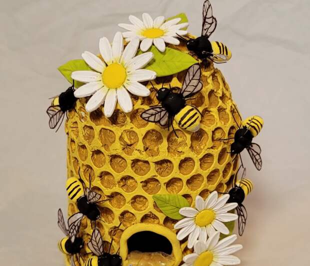 Аналогичным образом наложите «шубу» из сот на верхнюю часть заготовки. После высыхания сформируйте из массы для лепки несколько тонких колбасок. Пустите окантовку вокруг летока и по низу улья.