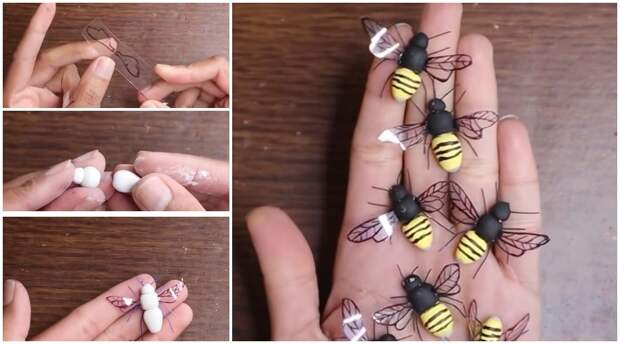 Остаток бутылки нарежьте на полосы, достаточные для того, чтобы сформировать крылышки. Прорисуйте их. Из массы для лепки сформируйте пчелок. Для надежности дополнительно скрепите мелкие детали при помощи тонкой проволоки, иголки или зубочистки. Не дожидаясь высыхания, вставьте крылышки, усики и лапки, сделанные из тонкой проволоки. После того как пчелки полностью высохнут, раскрасьте их.