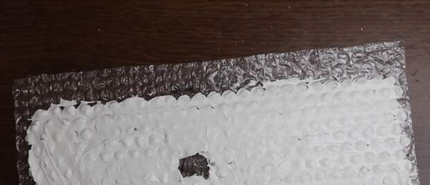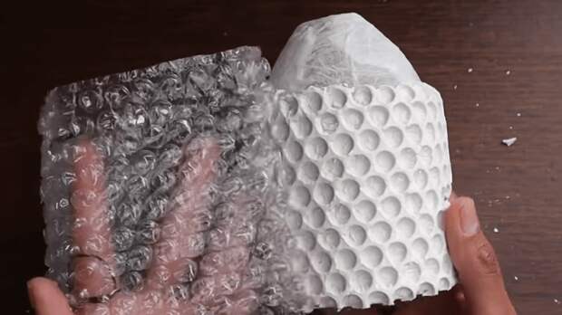 Распрямите пленку и уложите ее пузырьками вверх. Разведите немного цементной смеси или алебастра и равномерно покройте пленку до верхней отметки, оставьте окошечко.