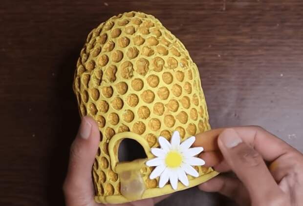 Окрасьте улей в желтый цвет. Чтобы придать блеск готовому изделию используйте краску с эффектом глянца. Интересным штрихом станут потеки меда, сделать их можно просто выдавив в нужном месте немного прозрачного или полупрозрачного клея из пистолета.