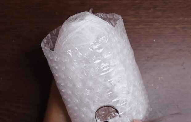 Сам улей не что иное, как верхняя часть пластиковой бутылки с обрезанным горлышком. Подравняв пластиковую заготовку. Сделав небольшой отступ от низа, определяем место для летока и сразу вырезаем его. В нашей поделке он похож на маленькое окошечко. Вырезаем 2 картонных круга, параметры которых будут соответствовать размерам верхнего и нижнего отверстий. Заклеиваем верхушку и донышко. Обильно смазав заготовку клеем ПВА, накладываем сверху кусочек тонкой натуральной ткани или салфетку, использовать можно даже марлю. Расправляем ткань по поверхности и даем заготовке полностью высохнуть. Находим кусок пузырчатой пленки, которого будет достаточно для того, чтобы обернуть заготовку. Намечаем маркером место окошечка, еще одну пометку делаем там, где заготовка начинает сужаться.