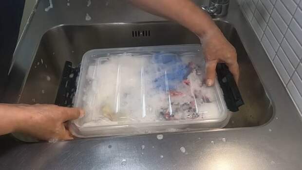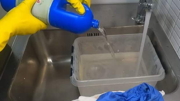 Теперь наберите таз горячей воды (из-под крана) около 5 л. Добавьте 0,5 стакана белизны и примерно 2-3 ст. л. любого средства для мытья посуды.