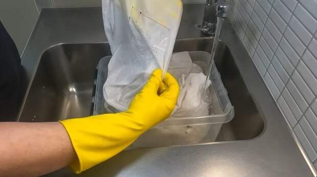 Намочите вещи в холодной воде. Это обязательный шаг перед отбеливанием, а потому не пропускайте его!
