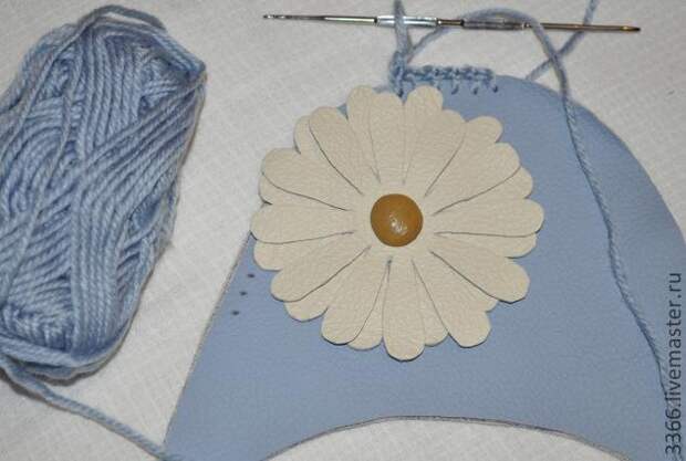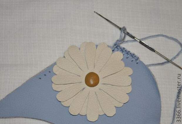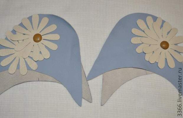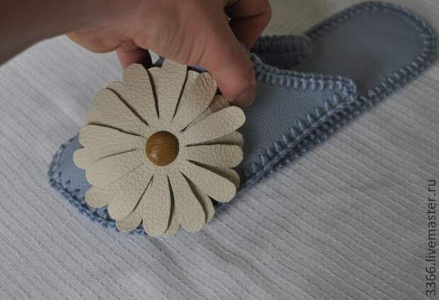 Наносим выкройку на кожу и раскраиваем верхнюю часть тапочка, она будет состоять из двух частей - внутренней части и внешней, т. е. всего для одной пары тапочек надо выкроить четыре детали. Затем начинаем заниматься декоративными элементами тапочками. На белой коже по трафарету вырежем ромашку и из маленького кусочка желтой кожи вырежем серединку. Все детали цветка слегка обожгем над свечкой, чтобы все края были ровные и аккуратные. Сшиваем ромашку, приклеиваем серединку и пришиваем к внешней заготовки верхней части тапочка. Для прочности можно чуть-чуть еще раз закрепить клеем.