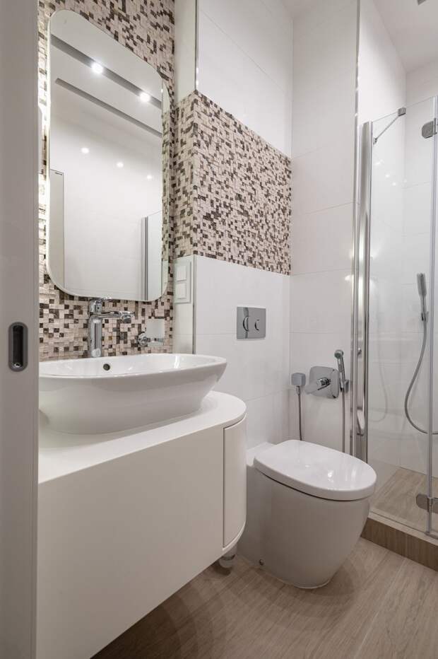Белая сантехника, белый пол, белый потолок, белые стены — это слишком для маленькой ванной. Отдавайте предпочтение светлым тонам, которые помогут визуально расширить ванную. Но не забывайте об акцентных деталях, которые сделают помещение более стильным и уютным.