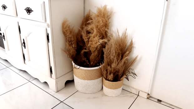 Ведра большого размера отлично подойдут для напольных элементов декора. Для оформления интерьерной корзины использован обычный джутовый канат. По мере укладки для дополнительной фиксации выбран клей.
