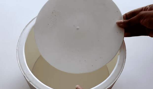 У этого пластикового ведра срезано донышко, но не полностью, а с отступом от края, по контуру присутствующей в литье выемки, которая станет надежным фиксатором для держателя. Совмещенные с основанием патрона от старой лампы длинные деревянные палочки станут каркасом под новый абажур.