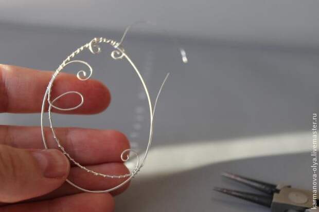 1. Берем 2 отрезка проволоки диаметром 0,6 мм длиной около 20 см. каждый. Затем 1 отрезок сгибаем в виде овала правильной формы, концы закручиваем с помощью круглогубец и перекрещиваем между собой, как бы делая узел из проволоки. Таким образом, мы сделали основу нашей серьги.