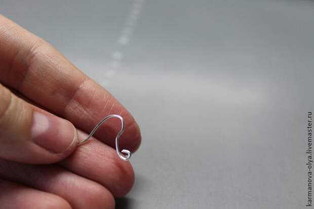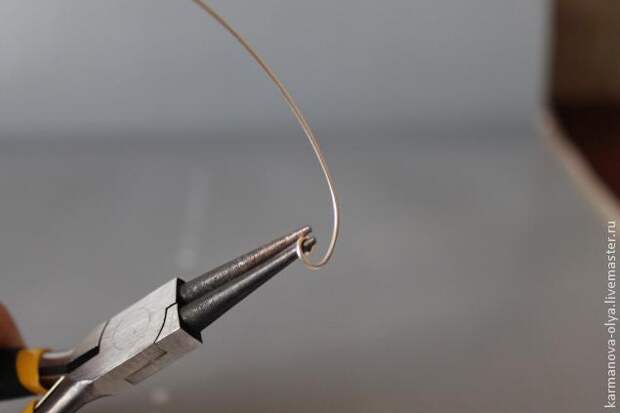 2. Затем берем отрезок проволоки диаметром 0,5 мм. длиной примерно 10 см., оба конца закручиваем с помощью круглогубец, условно делим весь отрезок на три части и, отмерив 1/3 часть, делаем красивую петлю в виде капли.