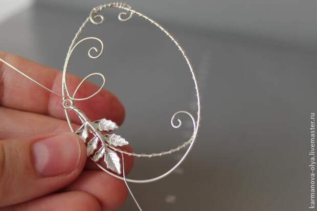 4. После этого с помощью той же проволоки диаметром 0,3 мм. и длиной около 15 см. мы крепим металлическую подвеску в форме листика к основе серьги и закрепляем для верности на проволоке, которая находится внутри основы. Концы проволоки аккуратно прижимаем к основным частям серьги, стараясь не повредить посеребренный слой проволоки (в идеале было бы замечательно, если бы у вас имелись в наличии тонкогубцы или плоскогубцы с силиконовыми наконечниками).