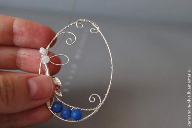 7. Затем делаем подвеску с бусиной синего агата для подвески с бабочкой. Для это 1 конец проволоки диаметром 0,4 мм. и длиной около 15 см. продеваем в отверстие бусины. С другого конца делаем петлю и второй конец проволоки продеваем в отверстие бусины, делаем другим концом проволоки такую же петлю с другой стороны бусины, после этого красиво обвиваем свободные концы проволоки вокруг наших петель и закрепляем вокруг этих петель, ненужные остатки осторожно откусываем кусачками.