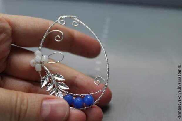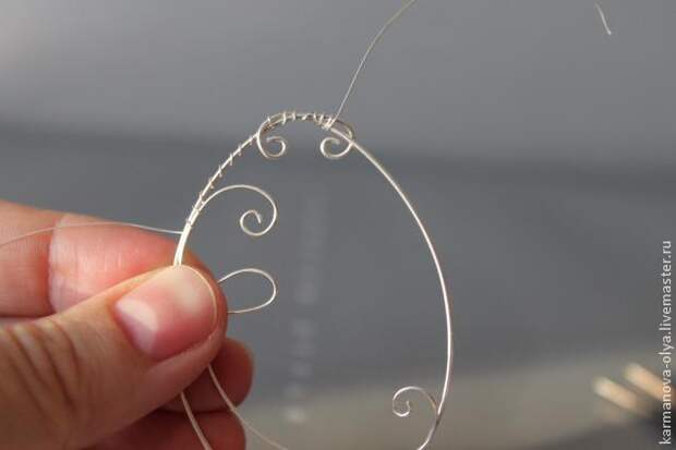 3. Затем берем проволоку диаметром 0,3 мм. и длиной 20-25 см. и начинаем сверху красиво обматывать нашу основу, закрепляя тем самым концы между собой. И на расстоянии около 2 см. от верха нашей основы, прикладываем проволоку с петлей внутрь основы и таким же образом прикрепляем ее к основе, оставляя внизу основы расстояние для украшения серьги.