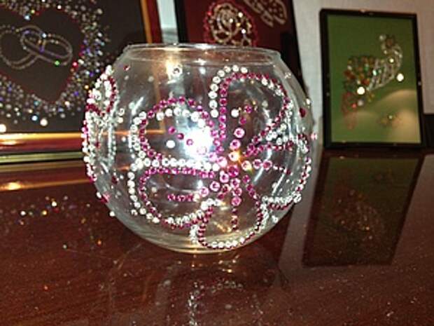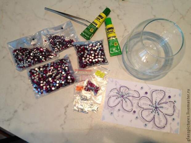 ваза, пинцет, клей эпоксидный, картинка, стразы, зубочистки, спирт.