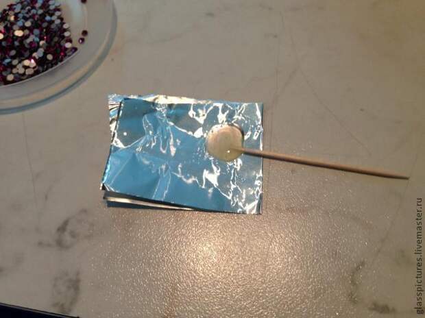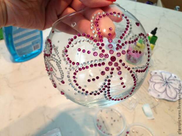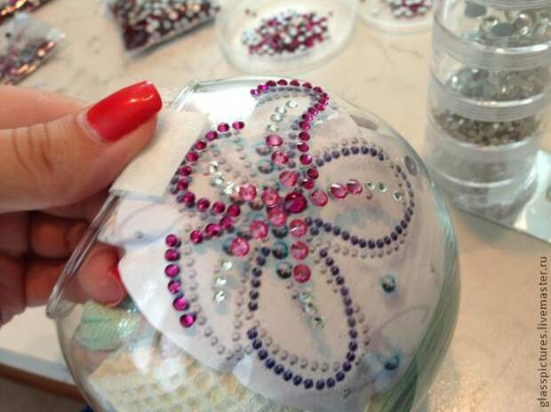 а теперь начинается сама работа - аккуратно, капелька за капелькой наносим клей по контору рисунка и на эти капельки приклеиваем стразы.